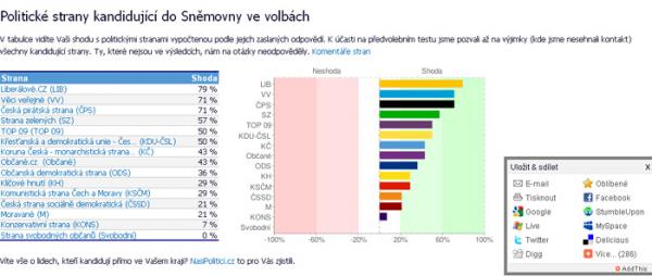 V tabulce, kterou vám web vygeneruje pak uvidíte vaši shodu s politickými stranami vypočtenou podle jejich zaslaných odpovědí. K účasti na předvolebním testu autoři webu pozvali až na výjimky (kde nesehnali kontakt) všechny kandidující strany. Ty, které nejsou ve výsledcích, na otázky neodpověděly.