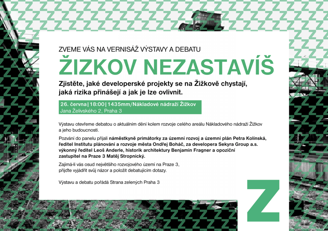 V pondělí 26. 6. 2017 v 18:00 se v kulturním prostoru 1435mm na Nákladovém nádraží Žižkov (Jana Želivského 2, Praha 3) koná vernisáž aktualizované a rozšířené putovní výstavy Žižkov nezastavíš. Výstava zachycuje patnáct developerských projektů připravovaných na území Prahy 3. Vernisáž doprovodí debata o aktuálním dění a budoucnosti celého areálu Nákladového nádraží Žižkov. Akci pořádá místní základní organizace Strany zelených ve spolupráci s kulturním prostorem 1435mm.