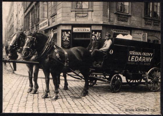 Ledařský povoz kolem roku 1925 stojí na křížení ulic Čajkovského a Bořivojova. V pozadí vidíme řeznický krámek Františka Jiráska, pozdějšího majitele domu. Ledaři zaváželi led do lednic pro uchovávání masa. Problém nastal, bylo-li potřeba například rychle rozmrazit prase, to se pak strčilo dětem pod peřinu na rozehřátí.