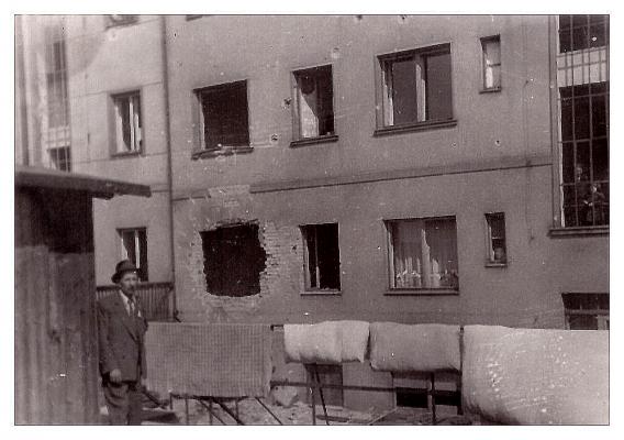 Ze vzpomínek pamětníků víme, že muž na snímku je krejčí z Michle. Pracoval u obchodníka s látkami Barhoňe v Husitské ulici. V době povstání se připletl Na Pražačku a když vypukly boje, ukryl se v přízemním bytě na snímku, kde strávil 48 bezesných hodin. Šťastně přežil a pár dní po osvobození se nechal vyfotit u rozstříleného okna svého úkrytu. Dokážete někdo tento snímek, pořízený v některém z vnitrobloků, lokalizovat?