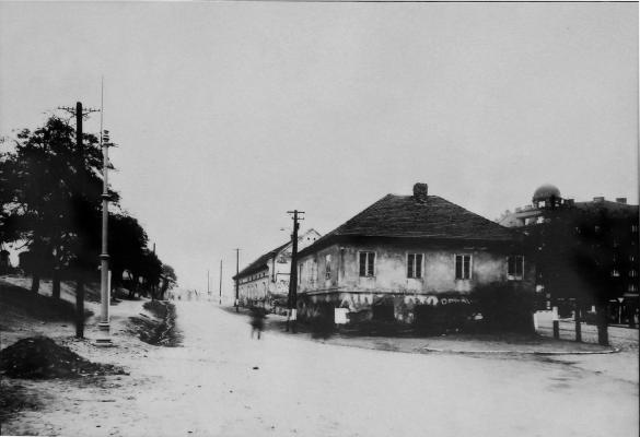 Usedlost Ohrada (č.p.11), která pojmenovala dnešní rušnou křižovatku. Usedlost Pražačka (č.p. 10) se nacházela za stromořadím vlevo. Vpravo nezaměnitelná silueta Hotelu Vítkov. (archiv rodiny Stomeovy)