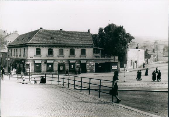 Snížená úroveň vozovky je dobře patrná na obou snímcích. Současně oba zachycují dům s hospodou U Zeleného stromu v době poválečné, tedy za provozu.