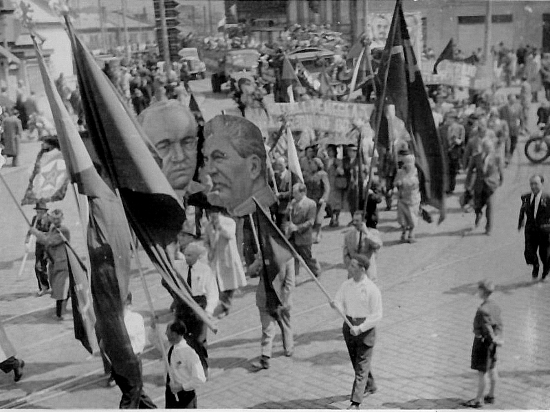 1. máj roku 1948 se ještě, dva měsíce po převratu, odehrává v provizorním období. Jednoznačně organizovaný jako připomínka únorového vítězství, ale ještě přece jen všelidová slavnost. Vše v duchu socialismu a dělnictva, které ostatně glorifikoval i protektorátní režim. Dělníci v prvomájových průvodech pochodovali i za války. Ovšem už dávno nepřipomínal prvorepublikové 1. máje, kdy o ulici bojovaly všechny strany politického spektra, navzájem si strhávaly plakáty a občas se popraly. Za první republiky to mnohem víc připomínalo dnešní 1. máj, kdy si to do ulic běží vyříkat extremisti všeho druhu. Komunistická slavnost je klidná a "Národní fronta" jednotná.