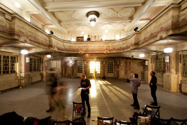 Okny neproniká světlo, jsou zatemněná. Sál byl poslední roky pro veřejnost uzavřen a jeho poslední využití pro filmařské účely dopadlo požárem. Tam, kde bývalo pódium, je umělá zeď z dřevotřísky, nad ní smutně visí ohořelé cáry kdysi těžké sametové opony a za nimi jen temná propast nikoli prkna, která znamenají svět. Divadelníkům tedy nezbývalo nic jiného než dispozici sálu otočit – na straně jeviště stojí tribuna hlediště a pod ní v prostoru se hraje. Okny by tedy na improvizované jeviště pronikalo nežádoucí světlo, a tak jsou zakrytá. Naopak kdysi hlavní vchodové dveře trůnící za zády herců, jejichž pravidelným mřížkováním proniká do sálu působivě světlo, se staly přirozenou součástí představení.