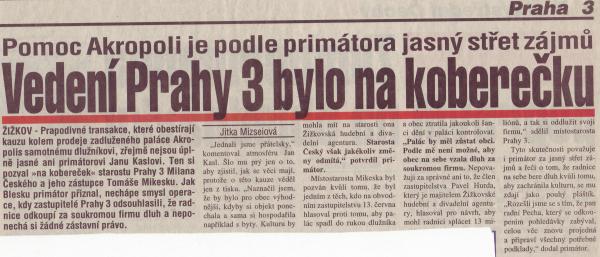 V roce 2000 proběhl za velmi podivných podmínek prodej paláce Akropolis radnímu za ODS Pavlu Hurdovi. Novináři se této kauze velmi podrobně věnovali, vybrali jsme proto několik článků na toto téma, které se v tisku objevily. Je to smutné čtení. Po kliknutí na obrázek se vám otevře článek v plné velikosti.