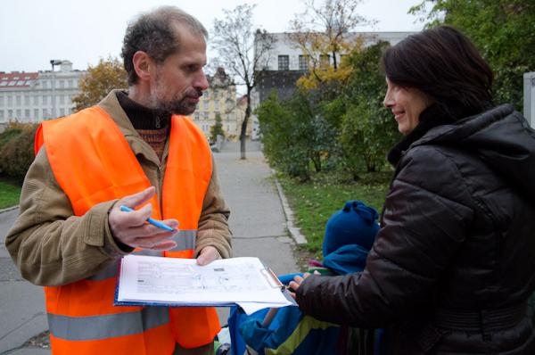 Anketa proběhla ve středu 2. 11. 2011 odpoledne v době od 14 do 17 h. S občany jsme vyplňovali formulář a zakreslovali jsme s nimi jejich pěší trasy. Pak jsme se zeptali na jejich názor na (ne)vybavení vestibulů Metra a podchodů bezbariérovým výtahem a eskalátory. Všichni byli vyzváni k doplnění mapky okolí o přechody, které jim chybí a ptali jsme se na další dopravně-stavební úpravy, které by na dotčených lokalitách uvítali.