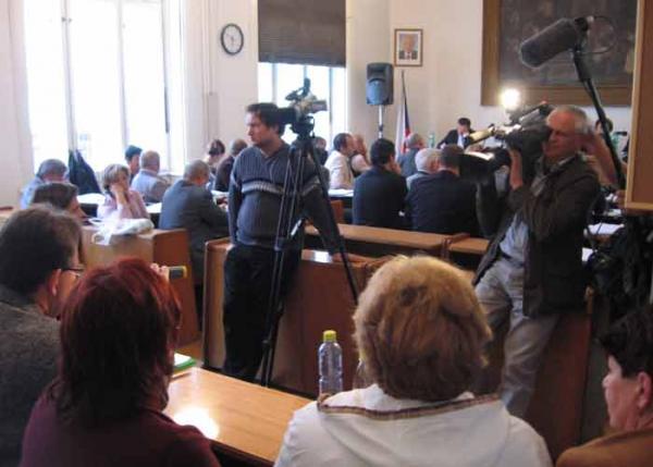 Opoziční poslanci se krčí v lavicích vlevo u oken (asi proto, že tam fouká), vpravo blíž k únikové cestě do kuloárů sedí ODS, na pódiu sedí páni radní a paní starostka. Ti na pódiu dotazy od těch vlevo nezodpovídají a znovu a znovu mumlají do mikrofonu slůvka jako "bude písemně", nebo"vždyť je to přece jasné". Ti vpravo dotazy nemají.