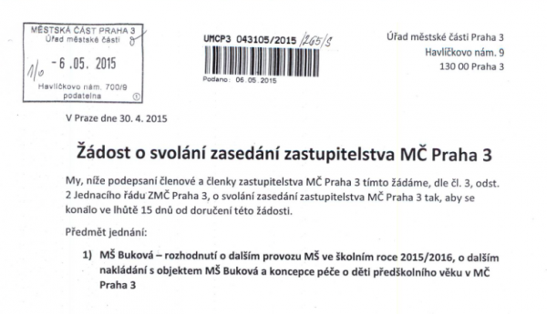 Kvůli MŠ Buková svolává opozice na tento pátek 22.5.2015 mimořádné jednání Zastupitelstva MČ Praha 3.