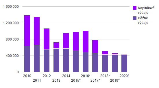 Výdaje rozpočtu v minulých a budoucích letech. Běžné výdaje jsou výdaje na každodenní chod úřadu, platy atd. Kapitálové výdaje zahrnují například rekonstrukce budov a veřejných prostor. Údaje jsou v tisících korun, tj. výdaje rozpočtu mezi roky 2010 a 2020 se pohybují zhruba od jedné a půl do půl miliardy. *Odhad.