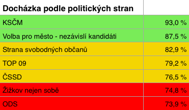 Účast podle politických stran vedou komunisté s účastí 93 %, jejich výsledek vylepšuje zejména Pavel Ambrož, který nechyběl ani jedné schůzi všech 5 komisí, v nichž zasedá. Práce v komisích se účastní jen komunističtí zastupitelé a nikoliv řadoví členové jako je tomu u ostatních. Na druhém místě se umístila Volba pro město, která se účastní práce jen ve dvou komisích a opět pouze prostřednictvím zvolených zastupitelů. Třetí solidní místo obsadila Strana svobodných občanů, dále TOP 09 a ČSSD. Podprůměrného výsledku pak dosahuje Žižkov nejen sobě a na posledním místě je se ziskem 73,9 % ODS.