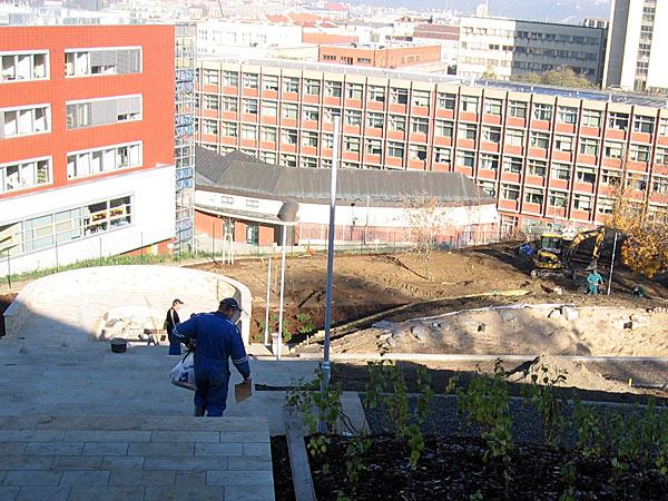 V lednu 2007 pak začala díky mírné zimě stavba a ta měla být dokončena v září 2007. To se však nestalo. Stavební firma objevila problémy s poruchami svahu v části přiléhající k areálu VŠE a to si vyžádalo úpravy projektu. 16.5.vzala Rada městské části na vědomí seznam dodatečných stavebních prací jako je výstavba opěrných palisád, změna povrchu komunikací apod. Zda byla navýšena i cena stavby a o kolik se bohužel nedá zjistit. Je otázkou pro zastupitele zda zde nebyla zvolena oblíbená metoda firem vyhrát zakázku s nejnižší cenou a pak v průběhu stavby dosáhnout její zvýšení na úroveň vyšší než ostatní nabídky.