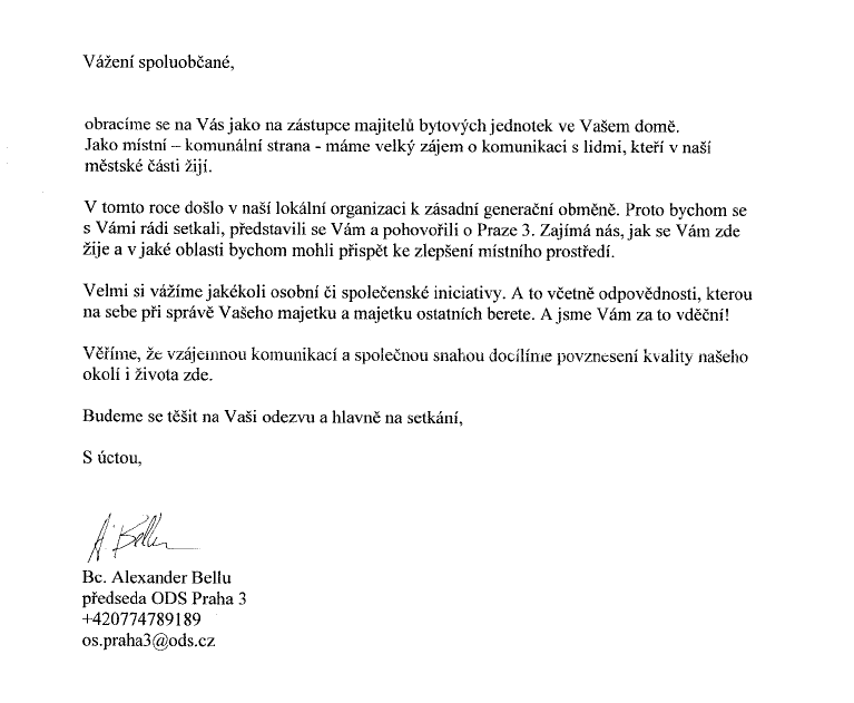 Kdyby mne ODS v Praze 3 oslovila e- mailem, byl by to spam a ten bych bez čtení hodil do elektronického koše. Pokud mne, jako předsedu SVJ ODS oslovila dopisem, tak je to oslovení důstojné To se mi líbí. Ten dopis jsem přečetl. Je o novém vedení ODS v Praze 3 a je v něm výzva ke spolupráci na řešení komunálních problémů. Asi měl být pozitivní zprávou, asi měl být pozitivní výzvou. Asi měl být o naději…