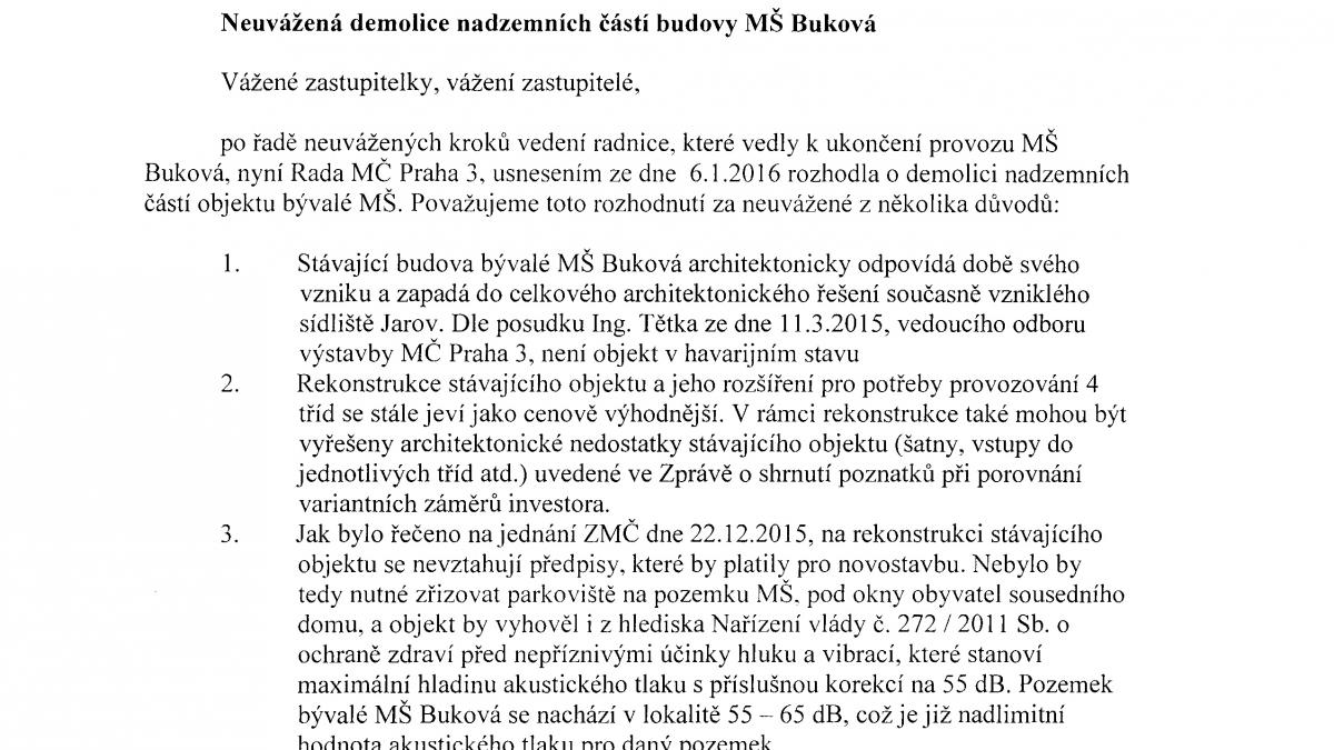 Tisková zpráva klubu zastupitelů Žižkov (nejen) sobě: Rada městské části Praha 3 rozhodla 9. března o zrušení MŠ Buková na Jarově. Na pozemku, kde školka stojí, chce výhledově postavit modulový jednopatrový objekt pro jesle. Dvoutřídní školka se specializuje na děti s respiračními problémy, ty se mají podle radnice přesunout do nově otevřené MŠ Jarov v ulici ...pokračování