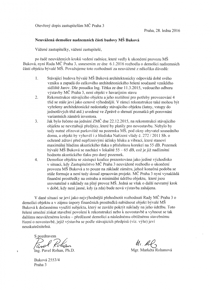 Stanovisko vedení radnice Prahy 3 k petici občanů Prahy 3 – zachování plného provozu MŠ Buková