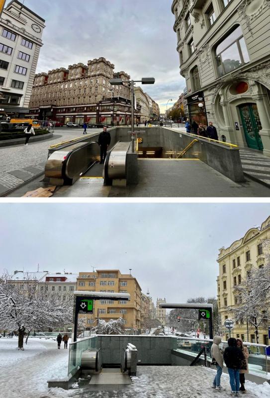 A já to teď možná schytám od obou stran. Totiž rozumím oběma pohledům na věc. Nezastřešené vstupy do metra, které netvoří vizuální bariéru ve veřejném prostoru, nejsou ničím novým. Podobné řešení najdete ve většině evropských metropolí. Mohl bych sem dát fotky z Londýna, Berlína či Vídně... ale dám sem jen fotku z centra Prahy. Nikdy jsem nezaznamenal tak obsáhlé debaty třeba o mokrých eskalátorech na Jungmanově náměstí. Pokud se nepletu, bylo tomu tady tak už v okamžiku otevření metra. Ta věc není zase tak nová a dokázal bych vyjmenovat řadu dalších míst.